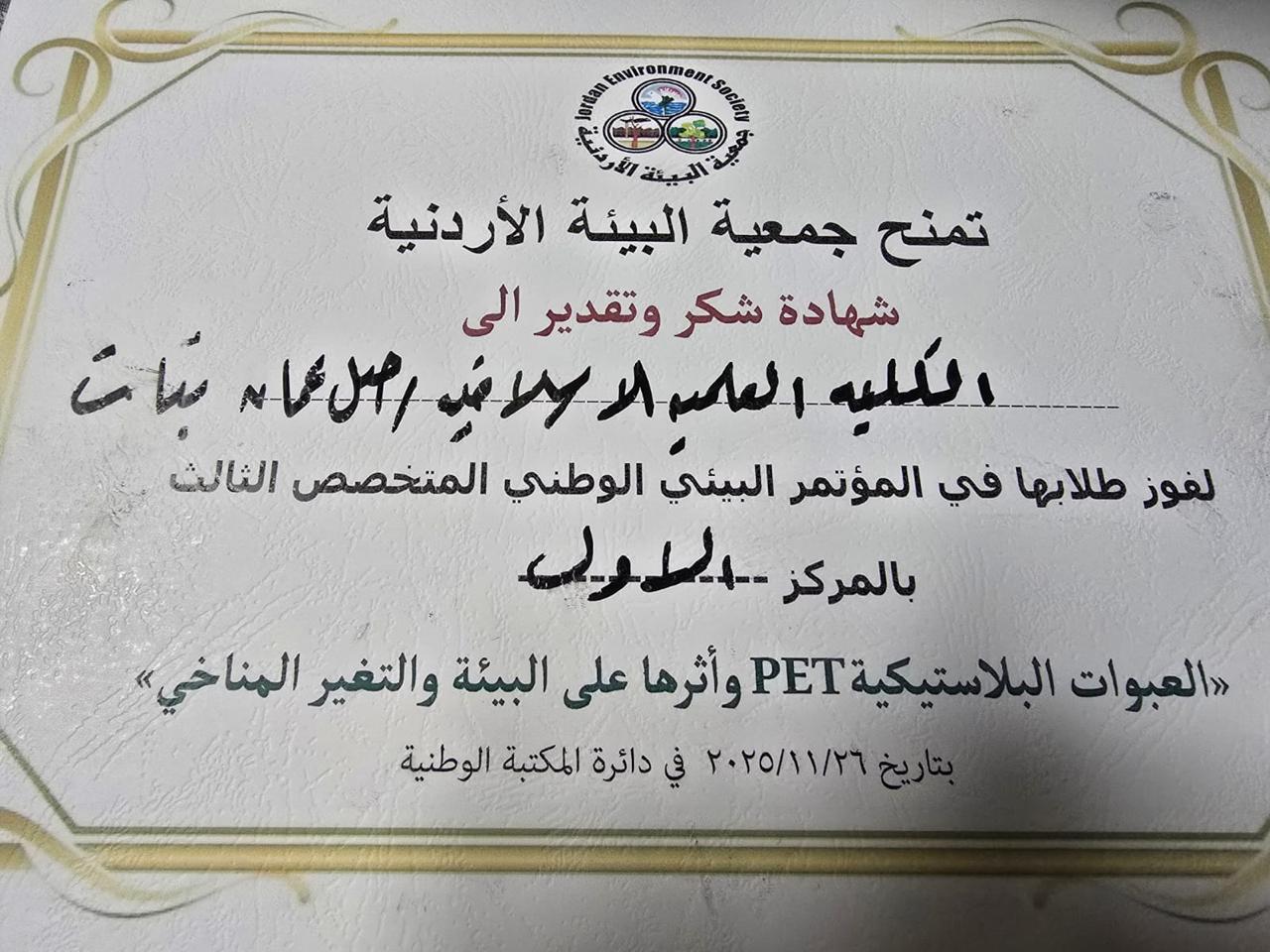 وجاء هذا الإنجاز عن البحث البيئي الذي قدّمته طالبات الصف العاشر لين طوير، ألمى مصطفى، ونتالي الدبوبي، تحت شعار أثر العبوات البلاستيكية على البيئة والتغير المناخي (PET).