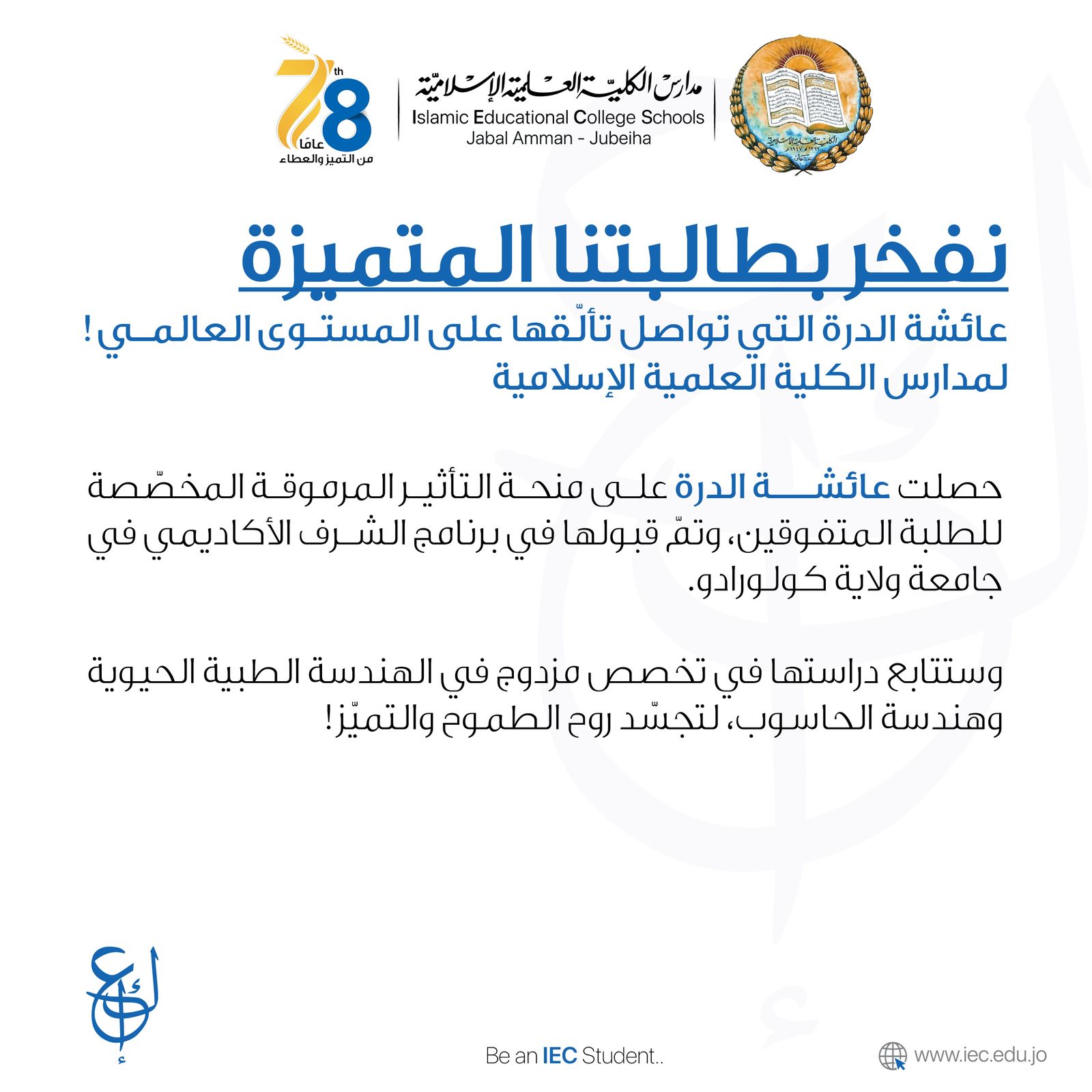 نفخر بطالبتنا المتميزة عائشة الدرة التي تواصل تألّقها على المستـوى العالمـي لمدارس الكلية العلمية الإسلامية حصلت عائشة الدرة على منحة التأثير المرموقة المخصّصة للطلبة المتفوقين، وتمّ قبولها في برنامج الشرف الأكاديمي في جامعة ولاية كولورادو ، وستتابع دراستها في تخصص مزدوج في الهندسة الطبية الحيوية وهندسة الحاسوب، لتجسّد